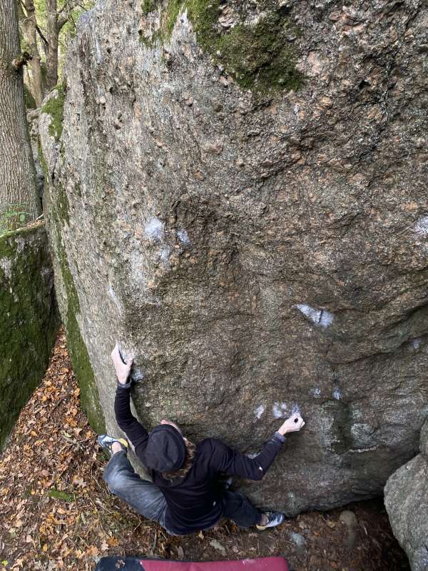Hög arete/vägg på det jättestora blocket i centrala utby. Startar under areten på backen. Klättras upp längst den vänsterlutande areten på dess högersida. Överhängande pinchig arete bryter över och blir teknisk och vertikal väggklättring på microgrepp, med areten för vänsterhanden. krux högt upp.