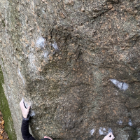 En bit ner i backen nedanför \"måste visst ta i\". Fin trubbig arete med små grepp. Har ingen aning om graden, vet inte ens om jag hittat lättaste sekvensen. Film på www.crimp.se
